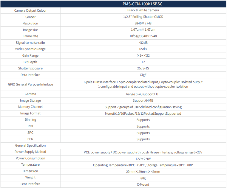 6. Complying with GigE Vision V2.0 protocol and GenLCam standard, supporting POE power supply and DC6V-26V wide voltage power supply;