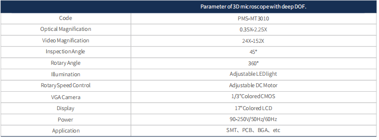 3D Video Microscope parameter table