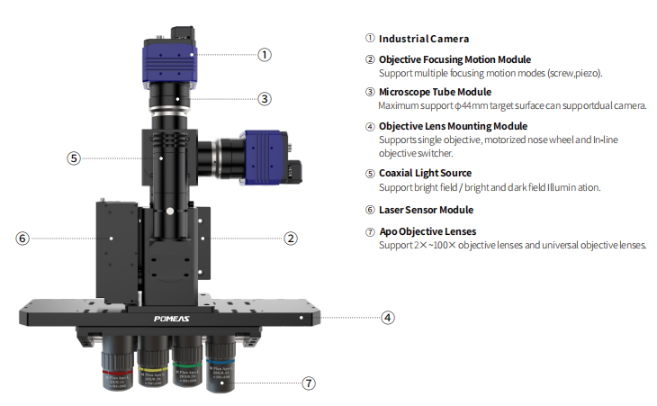 Universal objective lenses, commonly used 2X, 5X, 10X, 20X, 50X, 100X objective lenses can be applied; can be in the stationary or real-time movement of a variety of types of surface focusing, such as surface focusing, layered focusing, etc.;