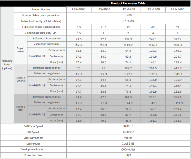 Laser profile sensor adopts the principle of laser triangular reflection: laser beam is amplified to form a laser line projecting onto the surface of the object under test, reflecting light through high-quality optical system is projected onto the imaging matrix, and the distance (Z axis) from the sensor to the surface under test and the position information along the laser line (X axis) are calculated. A set of three-dimensional measurements can be obtained by moving the measured object or the probe of the profilometer.