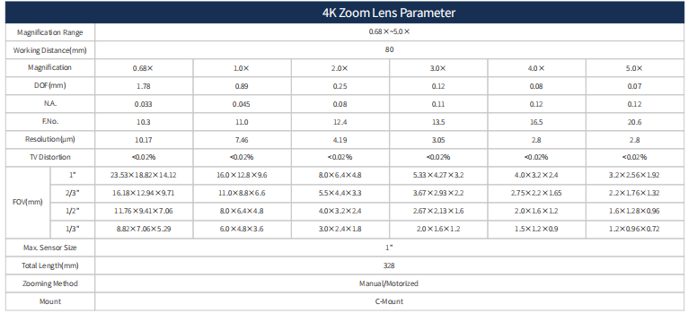 This 4K Detented Zoom Lens With Coaxial Illumination, with precise optical path design, with a large zoom ratio 0.68X-5.0X, Max. sensor size 1", working distance 80mm.